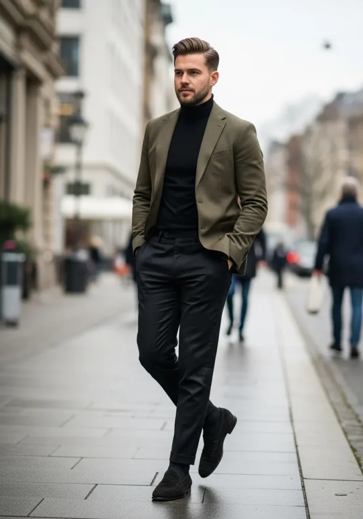 An olive green blazer is layered over a black turtleneck and dark trousers. The colors are muted but rich. Slim black boots complete the outfit and keep it refined. It feels elevated and slightly moody in the best way.