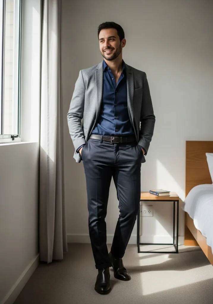This outfit combines a brown toned blazer with a dark shirt and gray tailored pants. The colors feel grounded and masculine. Black shoes keep everything sharp and cohesive. It feels classic with a modern edge.