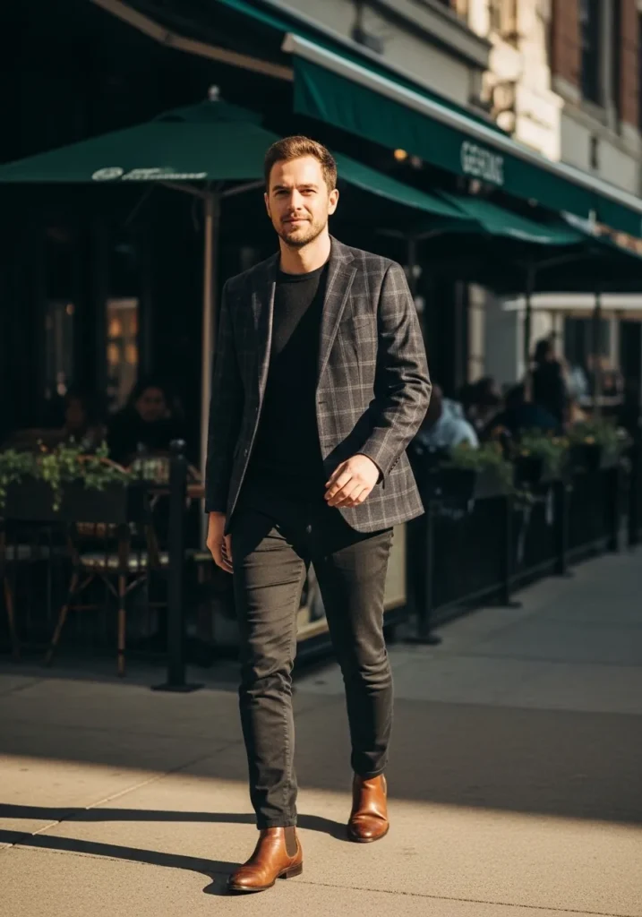 A dark patterned blazer is styled with a simple black tee and slim dark trousers. Brown leather boots bring warmth and contrast to the outfit. The overall vibe feels stylish and a little rugged while still staying business casual.