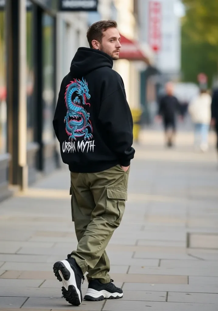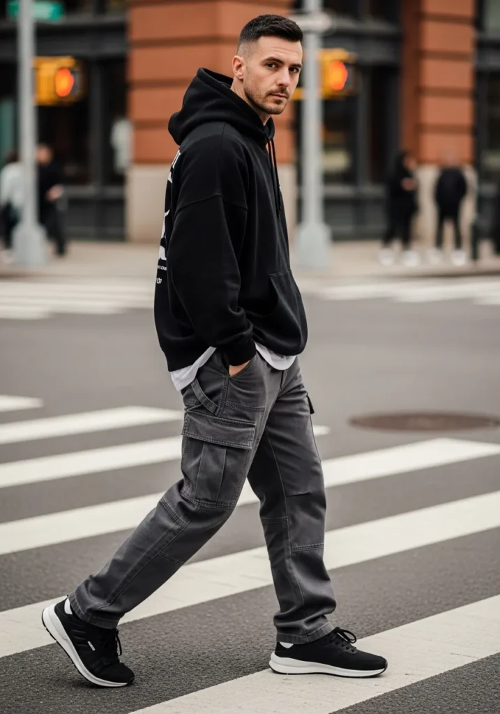 This look features a black graphic hoodie paired with olive cargo pants and chunky sneakers, creating a bold streetwear base that feels grounded and cool. The relaxed fit and utilitarian pockets give the outfit a functional edge while still looking city ready.