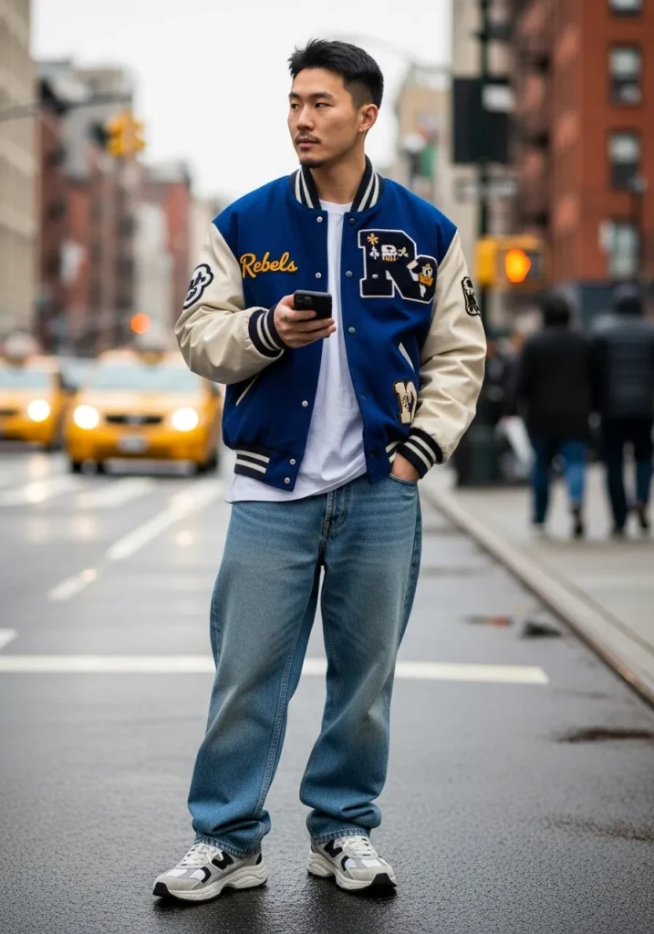 This look pairs a blue varsity jacket with a white tee, relaxed jeans, and chunky sneakers. The outfit feels sporty, bold, and very city appropriate.