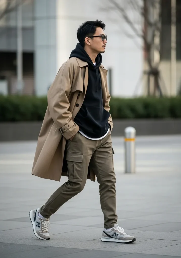 This look features a light trench style coat worn over a hoodie, paired with slim pants and sneakers. The silhouette feels modern and urban with a touch of sophistication.