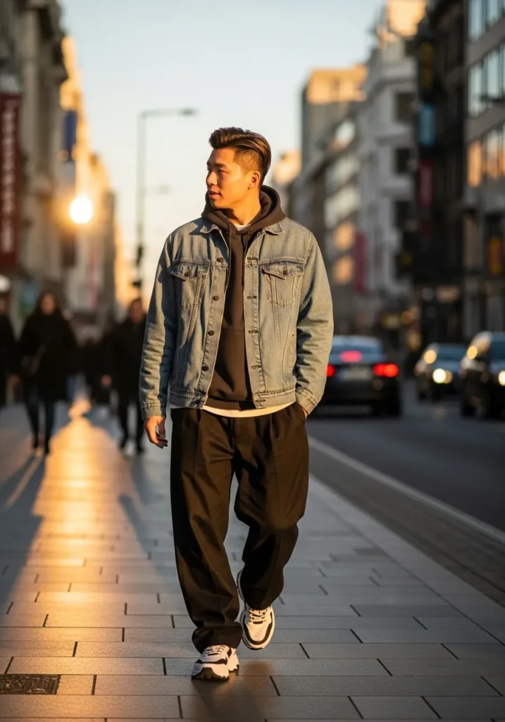 A classic denim jacket is styled with a dark hoodie, relaxed jogger style pants, and casual sneakers, all set against a warm city backdrop. The mix of structured denim and soft layers keeps the look balanced and wearable.