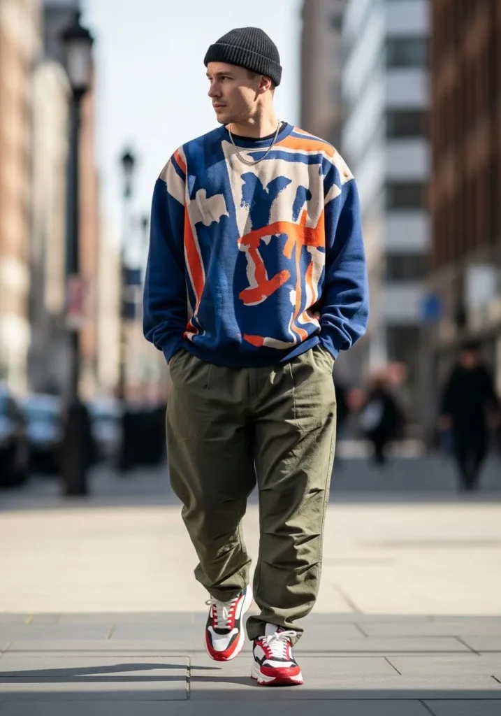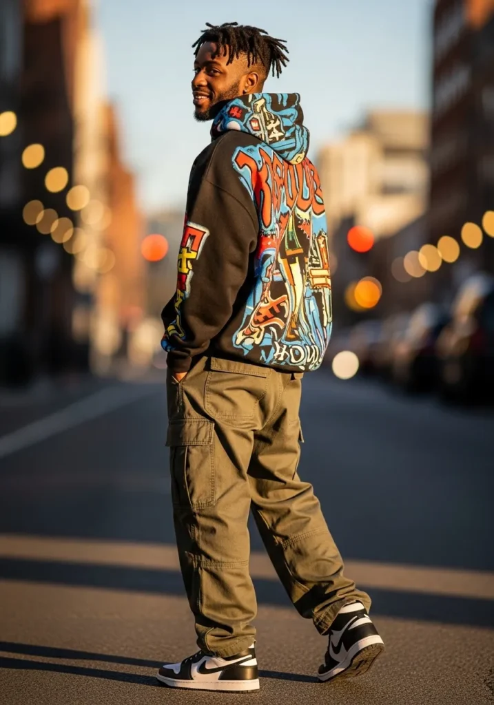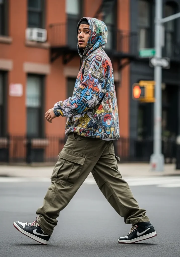 This look features a bold graphic hoodie paired with olive cargo pants and dark sneakers, creating a streetwear outfit full of personality. The relaxed fit and movement make it feel dynamic and expressive.