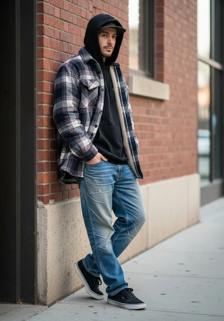 A plaid hoodie layered over a simple top is styled with classic blue jeans and sneakers for a casual street look. The textures add depth while keeping the outfit grounded.