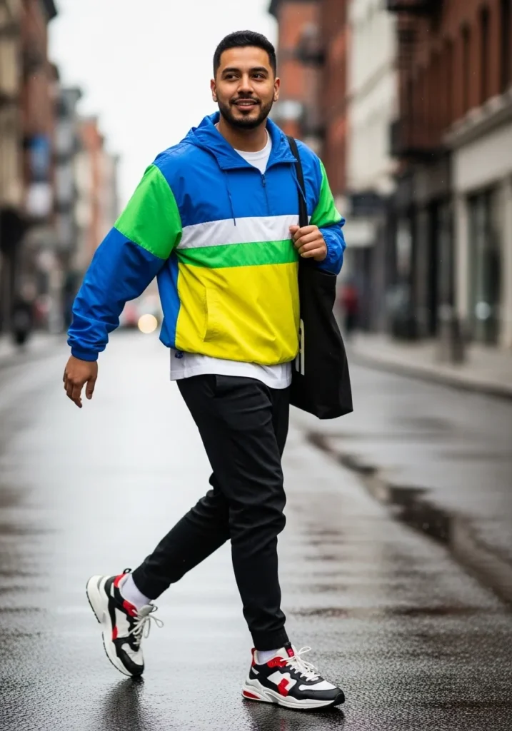 This outfit mixes a bold color block windbreaker with black pants and statement sneakers for a sporty streetwear vibe. The bright tones bring energy while the dark base keeps it balanced.