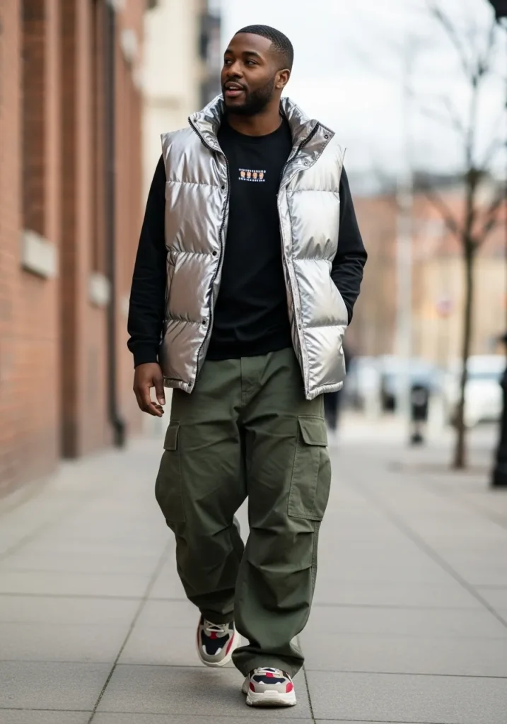 A metallic silver vest is layered over a black hoodie and paired with olive cargo pants and sneakers. The mix of textures gives the outfit a modern and edgy streetwear feel.