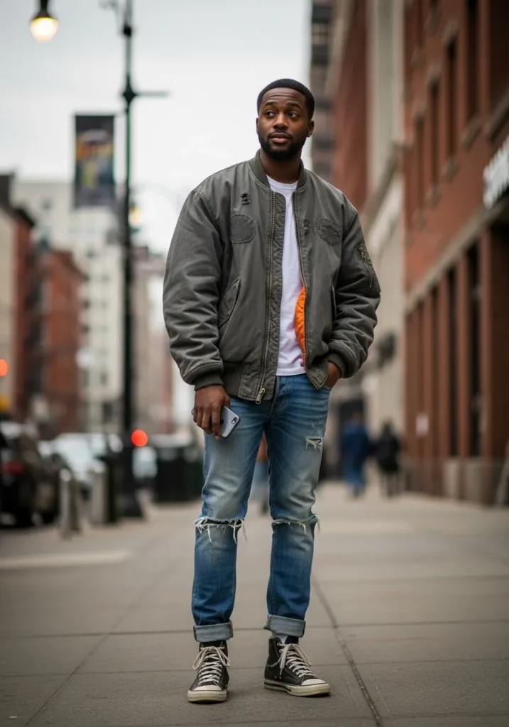 A bold varsity jacket is styled with a beanie, olive pants, and statement sneakers for a sporty streetwear vibe. The jacket brings that classic college feel into a modern city setting.