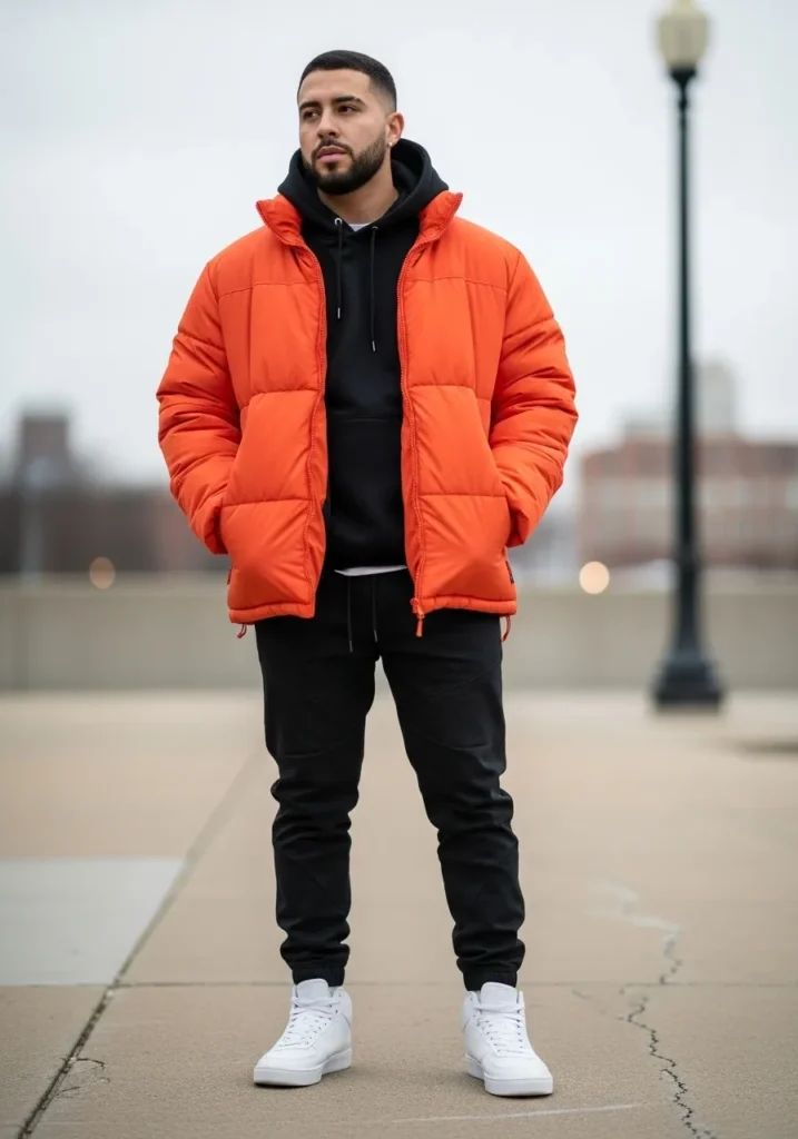 A bright orange puffer jacket is paired with a black hoodie, black pants, and clean white sneakers for a bold streetwear statement. The contrast makes the jacket pop instantly.