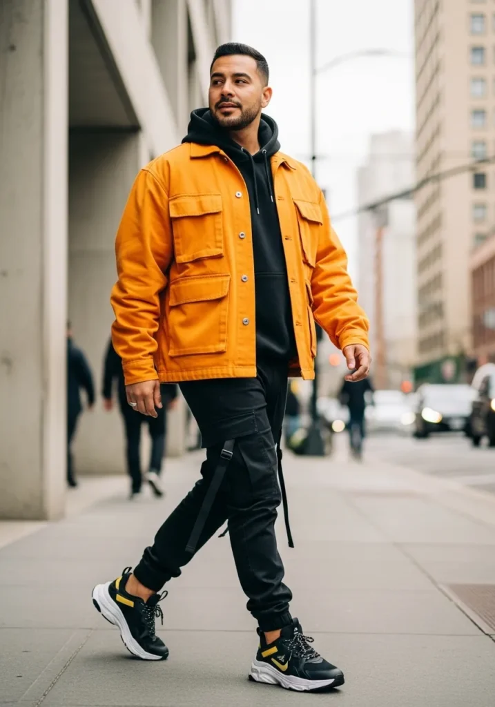 This look features a structured utility jacket layered over a bright orange hoodie, styled with dark pants and chunky sneakers. The mix of muted and bold tones keeps it visually interesting.
