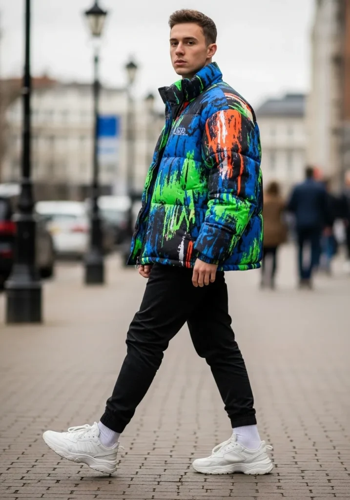 This outfit features a vibrant multi color puffer jacket paired with black pants and white sneakers. The jacket steals the spotlight while the rest of the look stays clean.