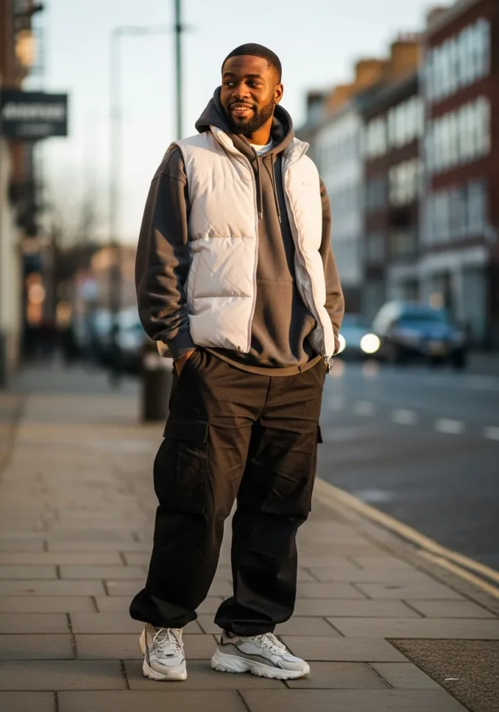 This outfit pairs a black padded vest with a neutral hoodie, light gray pants, and statement sneakers for a sporty urban look. The layers feel practical and relaxed, with a clean color palette that keeps everything sharp and modern.