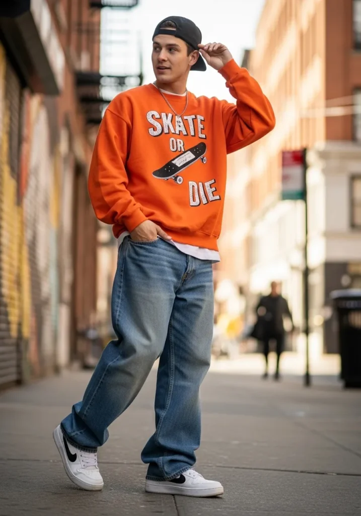 An oversized orange hoodie with bold lettering is paired with relaxed blue jeans and white sneakers for a classic skate inspired streetwear moment. The loose silhouette gives it that laid back, confident energy.