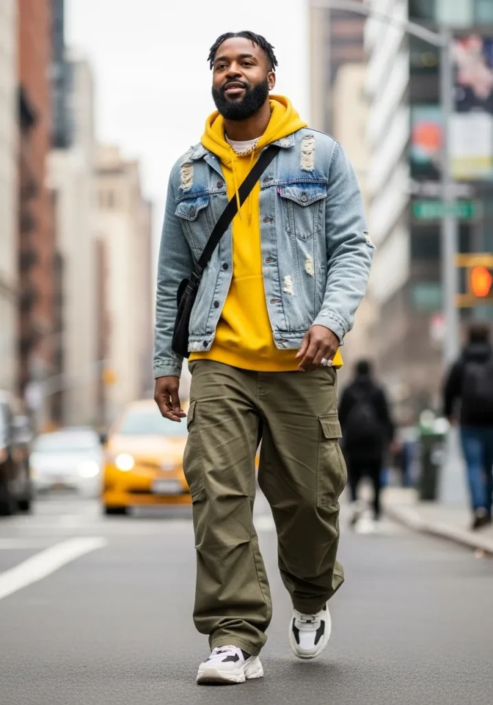 A classic light wash denim jacket is layered over a bright yellow hoodie, paired with olive cargo pants and sporty sneakers. The textures and colors work together to create a modern urban look.