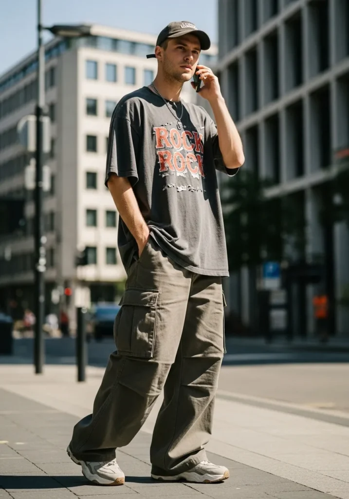 This look combines a vintage style graphic T shirt with loose fitting cargo pants and casual sneakers. The silhouette is relaxed and very street driven, perfect for everyday city life.