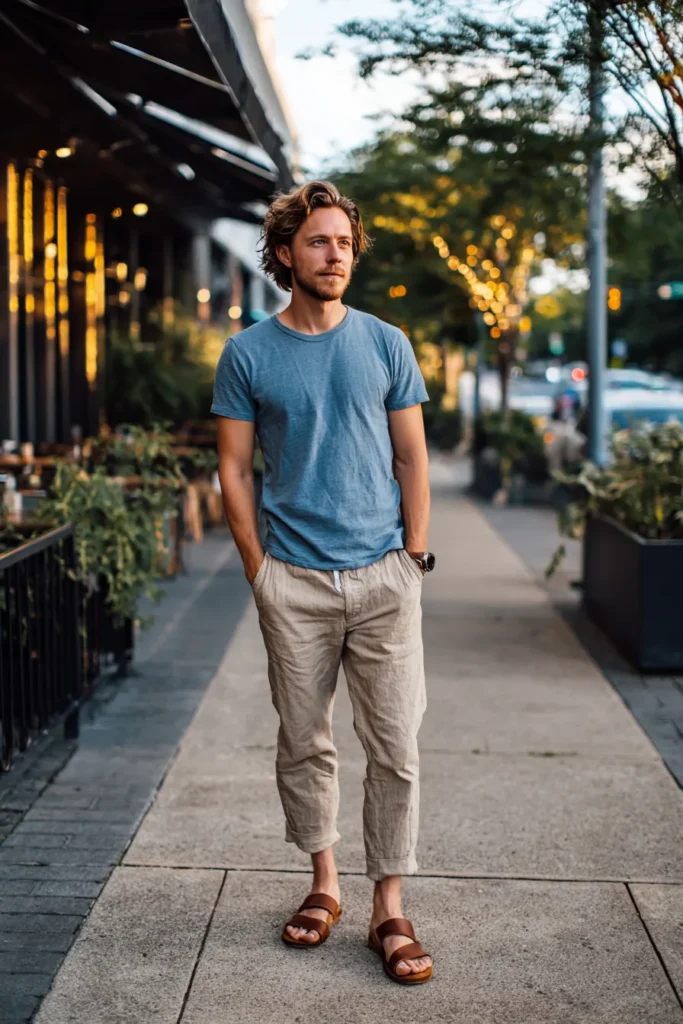 This is the ultimate easy-breezy casual outfit that still looks incredibly put-together perfect for a summer evening spent outside. He’s rocking a soft, slightly faded blue crewneck t-shirt that looks like it’s made from a lightweight, breathable material. This simple top is perfectly paired with relaxed-fit, cropped linen trousers in a pale tan or oatmeal color that are rolled up for extra style points. The look is totally effortless and finished off with comfortable dark brown leather slide sandals and a simple watch.