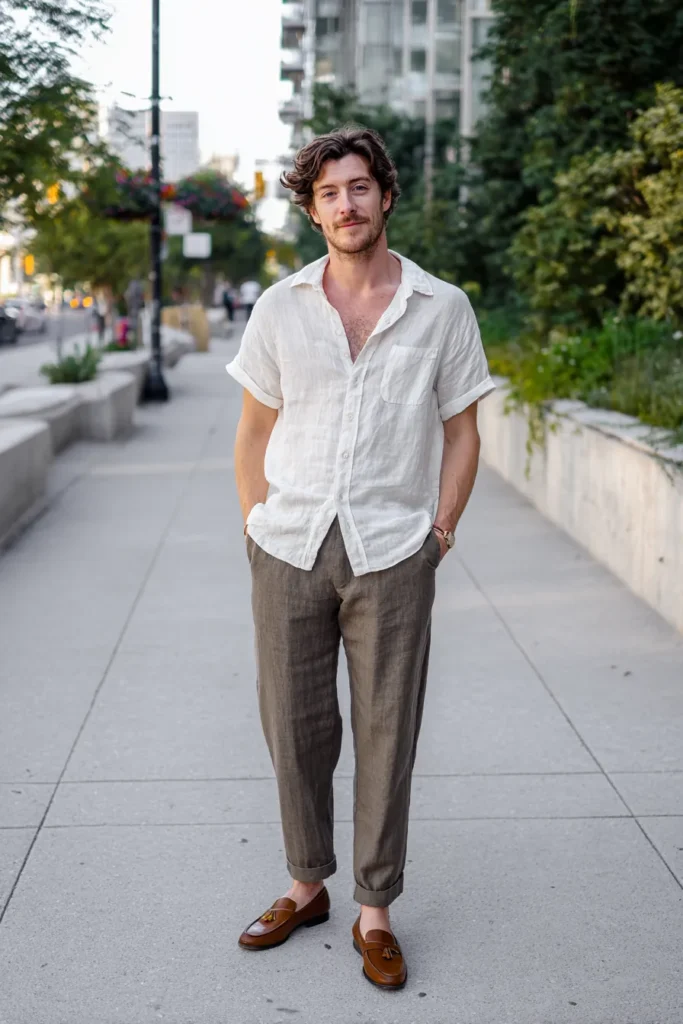 I seriously adore this look because the contrast between the crisp, bright white on top and the deep, grounding brown on the bottom is so striking and incredibly handsome. Both the shirt and the trousers are linen, which is the secret ingredient for staying cool while looking chic, letting the outfit breathe beautifully. The combination of the easy-going shirt and the polished loafers is genius because it strikes that perfect balance between casual and dressy. It’s definitely a winning look for summer!