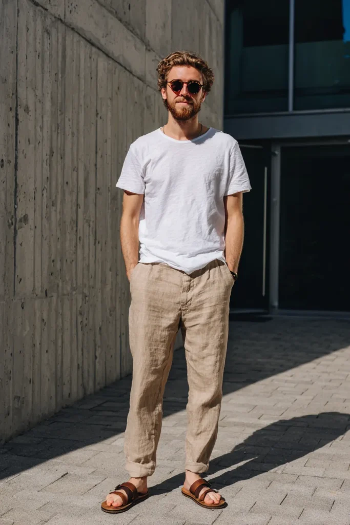 If you’re into effortless chic, this outfit is basically a masterclass in making simple basics look incredibly expensive. He’s wearing a perfectly fitted white crewneck t-shirt that looks like it’s made from a super soft, breathable fabric. That crisp white is paired with relaxed-fit linen trousers in a beautiful light tan or dusty beige color that are slightly cropped and look oh-so-comfortable. He’s finished the look with simple, classic brown leather slide sandals and some cool, round sunglasses with an amber lens.