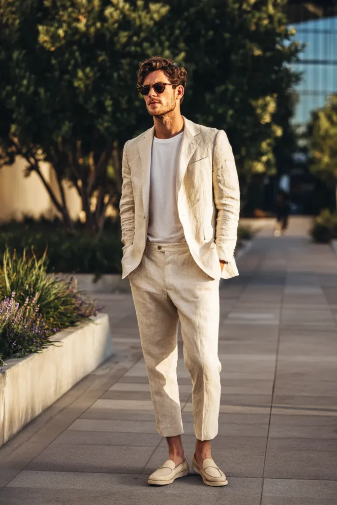Oh my goodness, if this doesn’t capture European summer style, I don’t know what does. This guy is serving up major confidence in a stunning light cream linen suit that looks perfectly relaxed and breathable for a warm evening. He’s layered the jacket over a simple, crisp white crewneck tee which keeps the whole look effortlessly cool and avoids feeling stuffy. Completing the ensemble are a pair of matching light beige loafers and some classic tortoiseshell sunglasses that just add that final touch of sophisticated mystery. The slight texture and natural wrinkles of the linen really sell this coastal chic aesthetic.