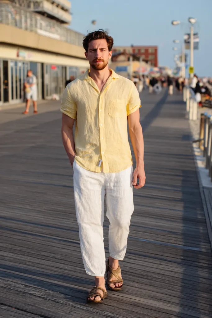 This outfit is giving me major vacation vibes and I love the pop of color against the bright white. He’s wearing a beautiful pale lemon-yellow linen shirt with short sleeves and a relaxed camp collar, buttoned up for a polished yet casual feel. This sunny top is paired with super breezy, wide-leg white linen trousers that are cropped just enough to show off those comfortable-looking brown leather sandals. The whole ensemble is incredibly light, airy, and screams stylish comfort perfect for a day near the beach or a seaside town boardwalk.