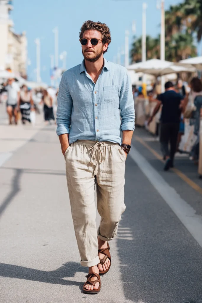 Okay, this is what I picture when I think of a gorgeous summer afternoon spent traveling or strolling a sunny promenade. He’s wearing a beautiful, faded sky-blue linen shirt with the sleeves casually rolled up to keep things breezy and the top unbuttoned for that relaxed feel. This light blue is paired perfectly with easygoing drawstring linen trousers in a pale khaki or stone color, which are cuffed just above the ankle. Finishing off this effortlessly cool aesthetic are some stylish dark brown leather sandals and classic round sunglasses.