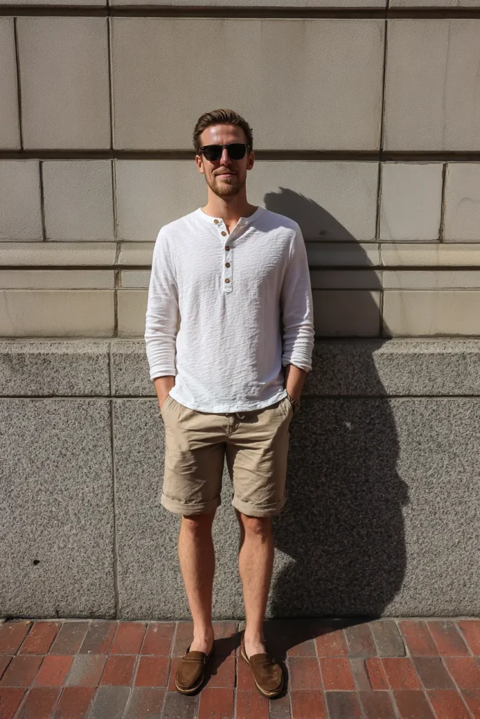 This look is such a great example of smart casual dressing for those slightly cooler summer evenings or breezy days. He’s wearing a textured white long-sleeve Henley shirt with those cute little wooden buttons, which is a perfect lightweight alternative to a t-shirt. The top is paired beautifully with some tailored khaki shorts that are cuffed neatly above the knee. The whole thing is finished off with rich, earthy brown suede loafers and cool black sunglasses, giving a polished yet relaxed feel.