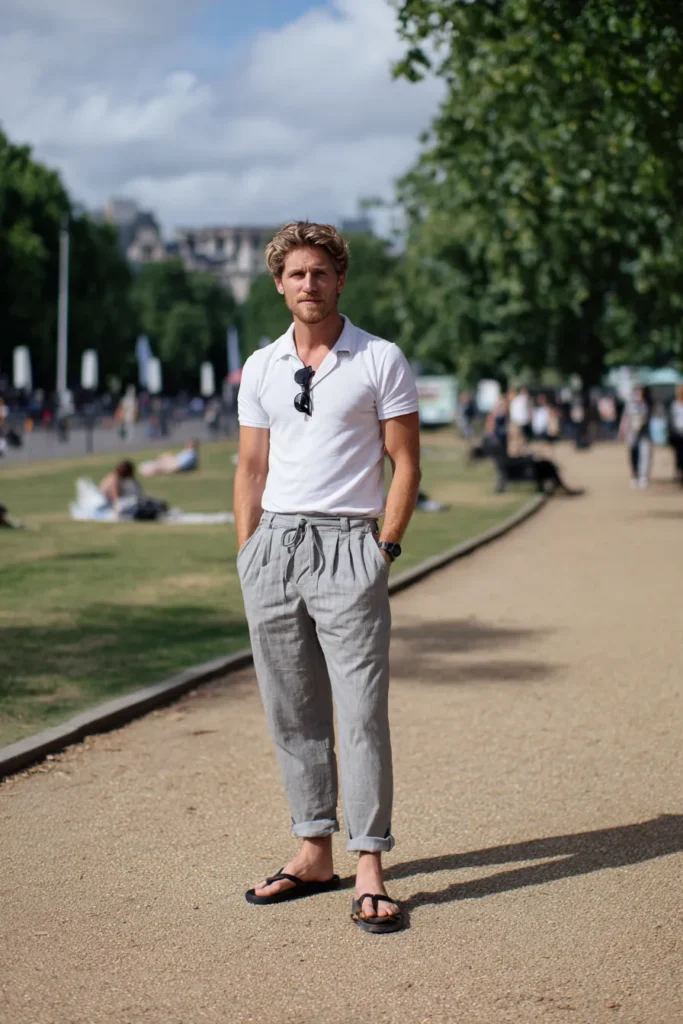 This outfit is the definition of relaxed summer sophistication perfect for a warm day in the park or a casual weekend. He’s wearing a clean white fitted polo shirt tucked crisply into a pair of super stylish light gray pleated trousers that look like they’re made of linen or a light cotton blend. The trousers have a cute rope drawstring waist and are cuffed at the bottom, paired casually with dark flip-flops for maximum summer comfort. The whole look is light in color but heavy on style, giving off a really smart, European vacation vibe.