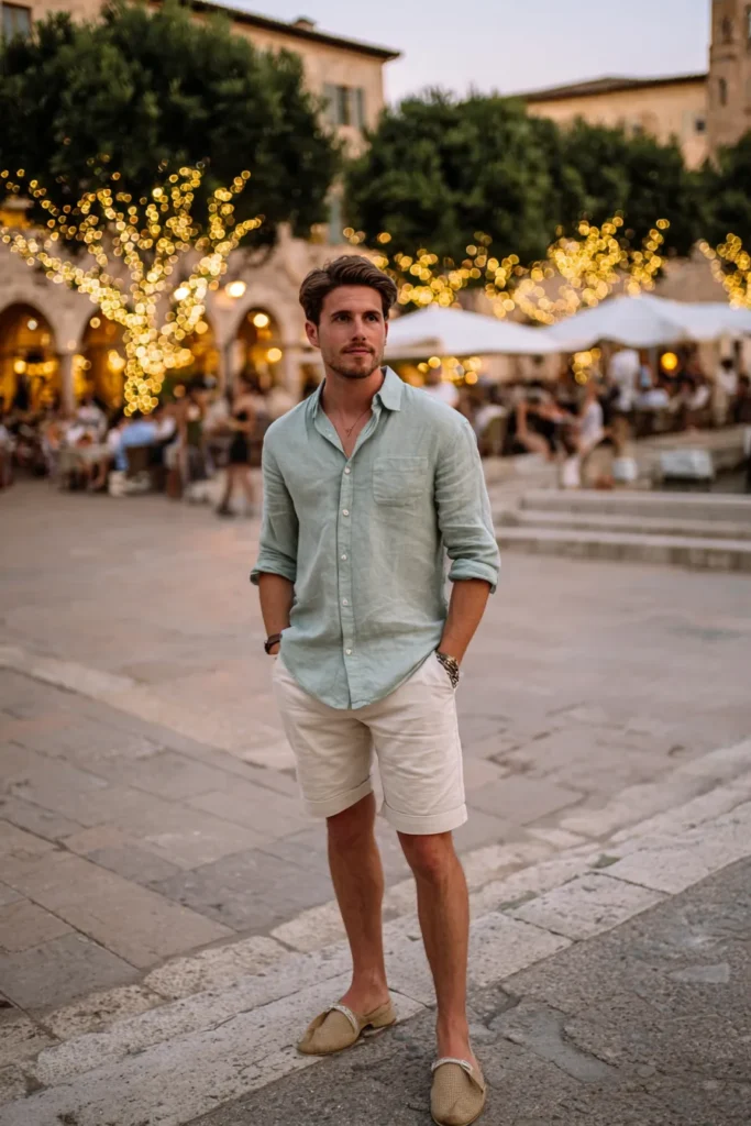 Seriously, this is the most romantic summer evening look perfect for a European piazza. He’s wearing a lovely, faded mint green linen button-down shirt that is left untucked and has the sleeves casually rolled up to the forearms. The dreamy top is paired with crisp, cream-colored shorts that have a great tailored fit and stop a few inches above the knee. The outfit is completed with natural straw or woven espadrille flats, giving the whole ensemble a light, nautical, and incredibly chic feel.