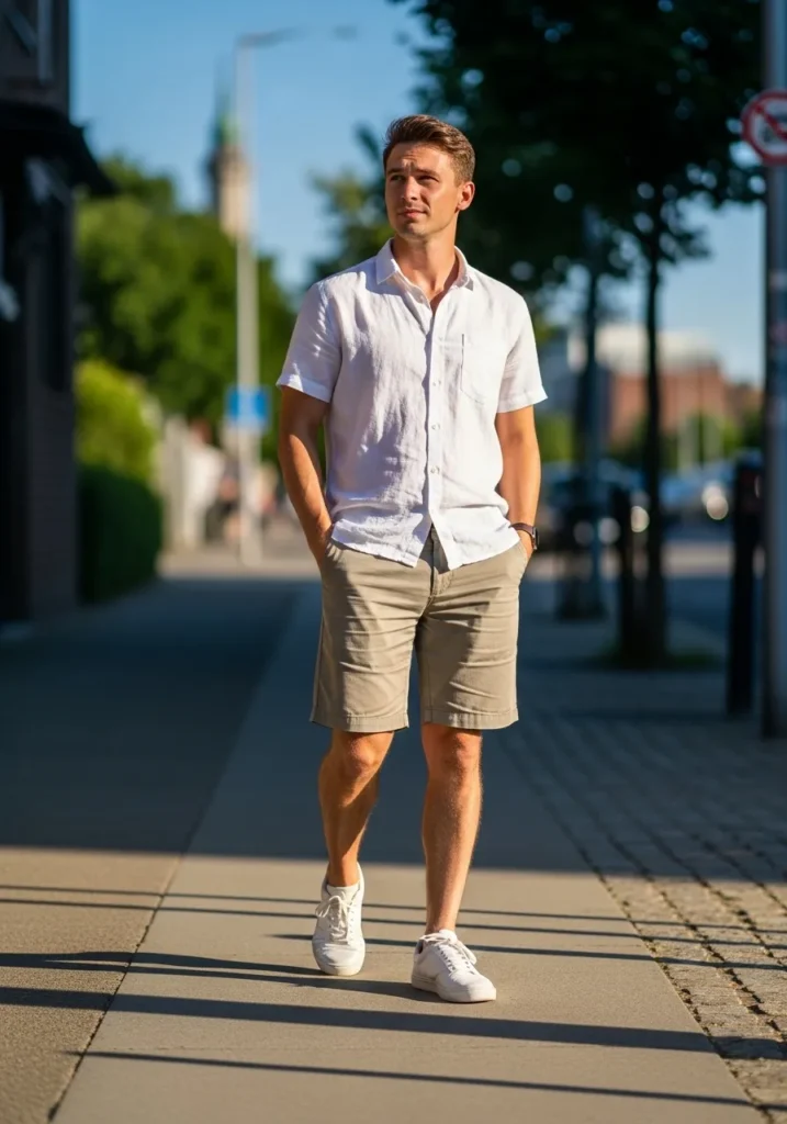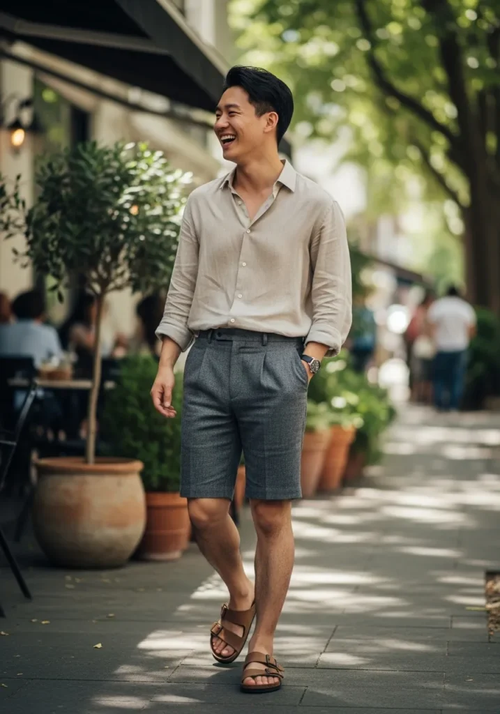 A relaxed linen shirt styled with tailored shorts and leather sandals creates a perfect café style summer outfit. The soft tones and airy fabrics make it feel laid back and chic.