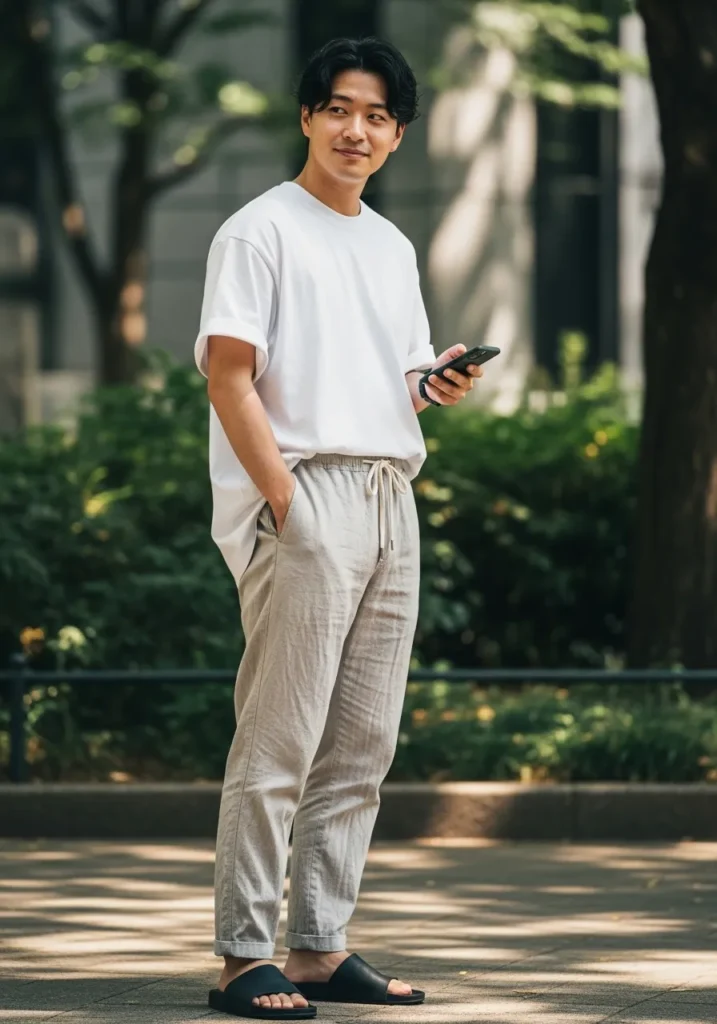 This outfit features a clean white T shirt paired with relaxed beige linen trousers and casual sneakers. The lightweight fabrics and easy fit make it feel breathable and comfortable for warm days spent outdoors.