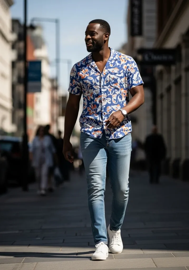 This outfit pairs a patterned short sleeve shirt with light wash jeans and white sneakers for a playful summer feel. The colors add personality while staying relaxed.