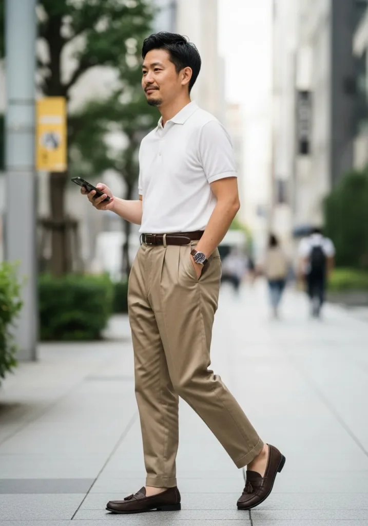 Here we see a fitted white T shirt paired with tailored tan trousers and casual shoes. The contrast between relaxed and refined pieces keeps the outfit interesting.