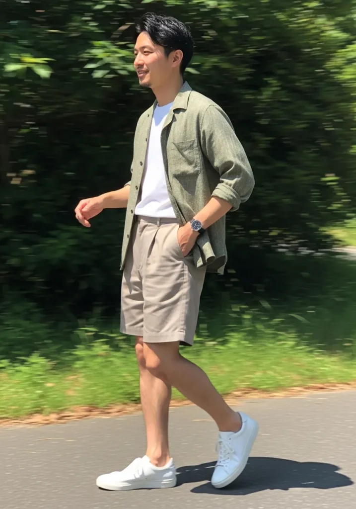 This look layers a light neutral jacket over a white T shirt and pairs it with tailored shorts and sneakers. The fabrics feel soft and breathable which keeps it summer friendly.