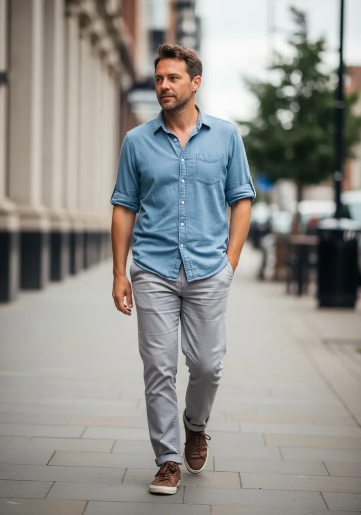 This outfit mixes a relaxed light blue button up with soft gray trousers and brown casual shoes. The fabrics look breathable and slightly textured which adds depth without heaviness.