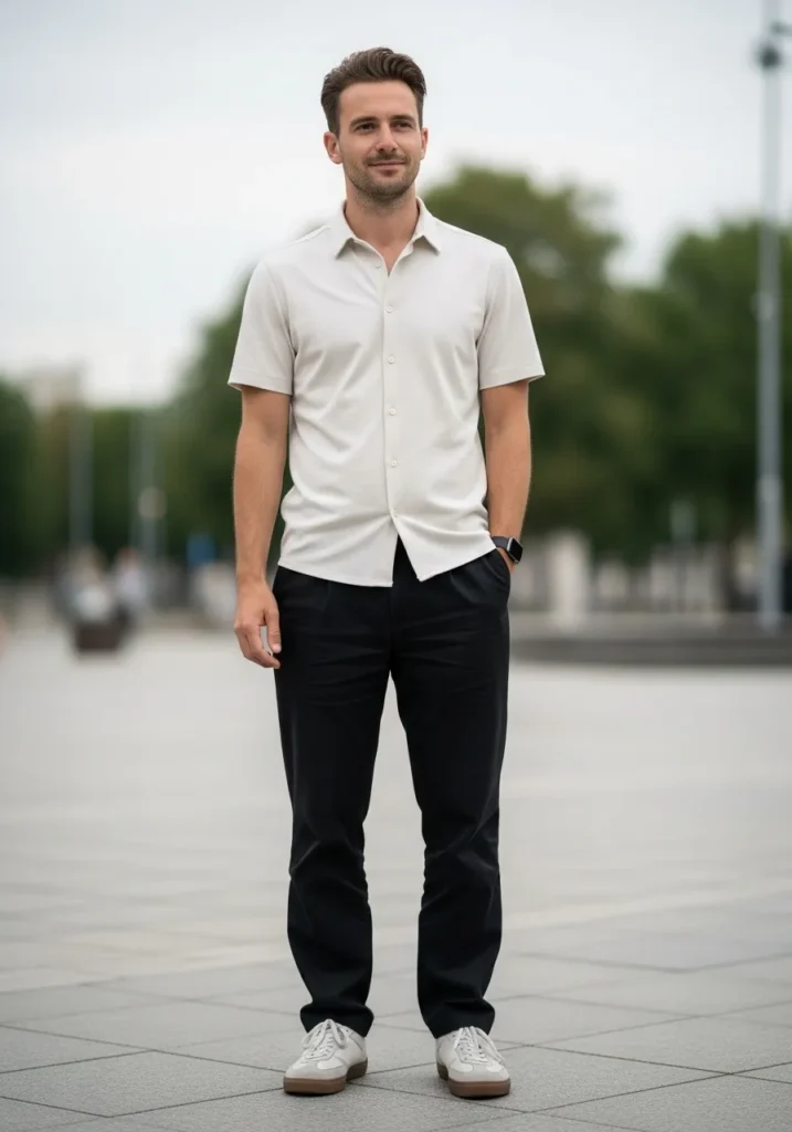 A crisp short sleeve button up shirt paired with straight black trousers and neutral sneakers creates a sharp but breezy summer look. The clean lines and lightweight fabric keep it minimal and fresh.