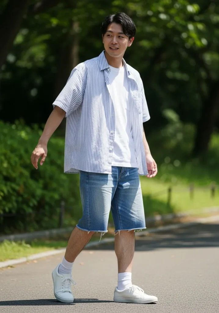 This outfit pairs a light button up shirt with relaxed denim shorts and casual sneakers. The fit feels loose and airy which is perfect for summer days.