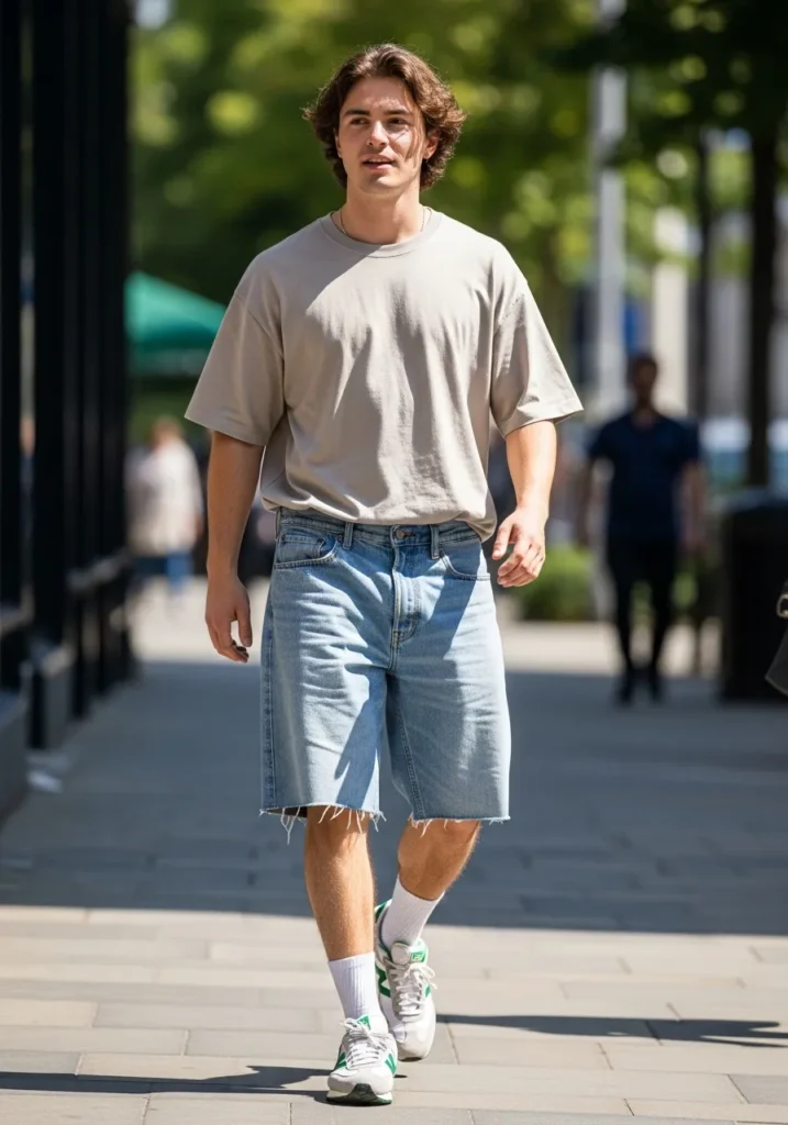 This outfit features a soft oversized beige T shirt styled with relaxed denim shorts and casual sneakers. The loose fit and simple pieces make it feel youthful and perfect for sunny days spent outdoors.
