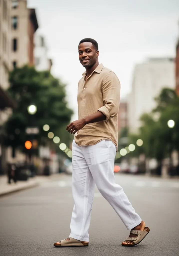 Here we have a breezy beige linen shirt worn with bright white trousers and relaxed sandals, which instantly gives off warm weather confidence. The lightweight fabric and open neckline keep things airy and casual while still looking put together.