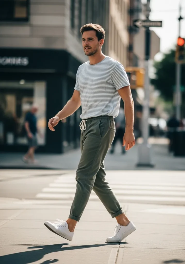 This outfit pairs a light neutral T shirt with slim olive trousers and clean white sneakers, creating an easy summer casual look that feels modern and breathable. The slightly cropped pants and soft fabric keep it light, while the muted color palette makes everything feel intentional without trying too hard.