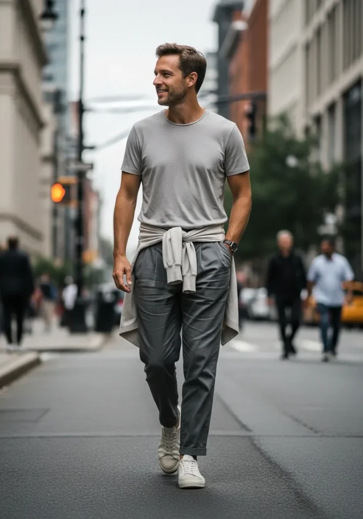 This look features a neutral T shirt styled with darker trousers and a lightweight layer tied casually at the waist. The sneakers keep it grounded and wearable.