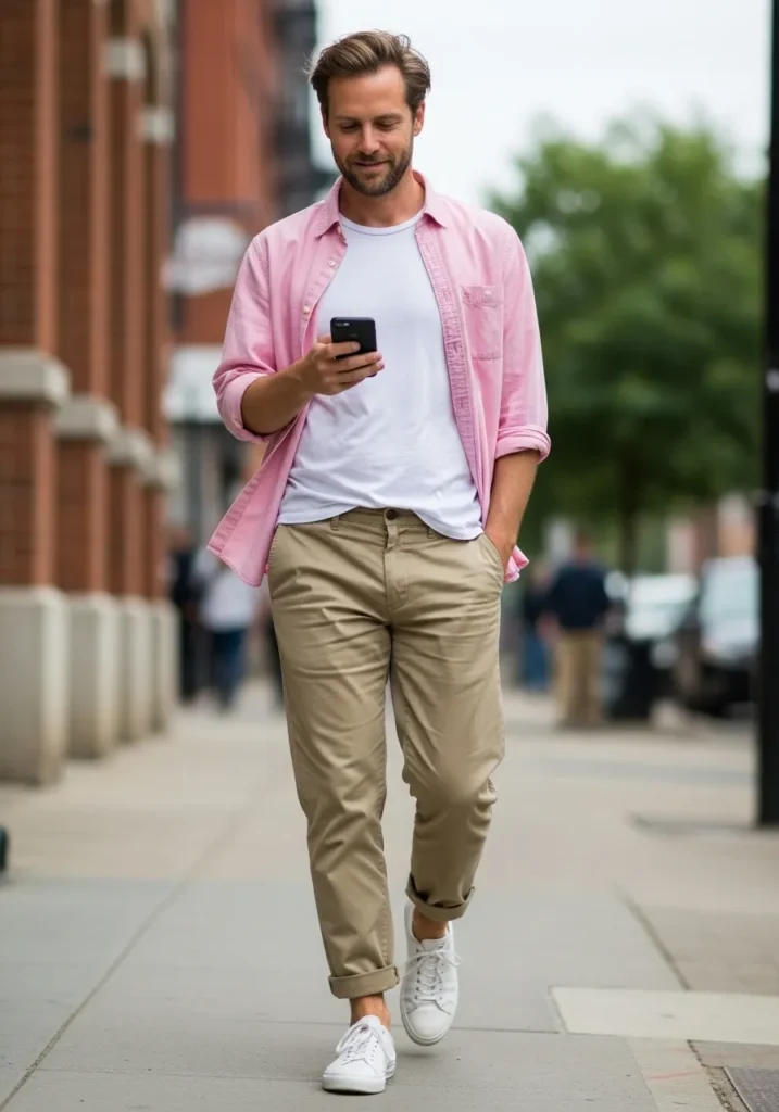 This outfit layers a soft pink overshirt over a white T shirt with neutral trousers and sneakers. The lightweight layers keep it breezy while adding color.