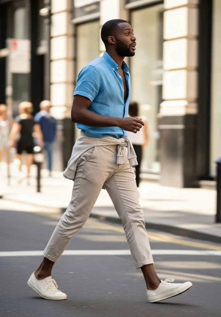 This outfit combines a soft neutral shirt with beige trousers and casual sneakers. The lightweight materials and relaxed fit make it ideal for warm city walks.