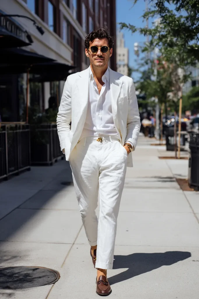 This look is the epitome of effortless summer chic with a beautiful all-white ensemble featuring a lightweight linen suit. The jacket and trousers are perfectly tailored in a crisp white shade, which is beautifully echoed in the unbuttoned, open-collar dress shirt beneath. The fabric looks breathable and relaxed, giving off a refined vacation vibe. The only touches of contrasting color are the rich brown leather loafers, which add an earthy grounding element, and the subtle gold hardware on the belt and wristwatch. Finishing the outfit are classic round-frame sunglasses, lending a touch of old Hollywood glamour.
