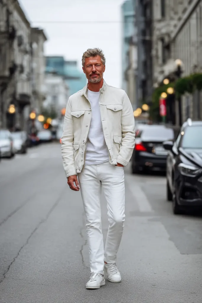 I think this works because the white color makes the traditionally casual pieces, like the utility jacket and jeans, suddenly feel sophisticated and intentional. Some people love their denim, and this is such a fantastic way to wear it that feels super fresh for a date or weekend outing. The subtle difference in shade between the creamy jacket and the bright white pants adds that touch of depth that keeps it interesting. Plus, the bright white against the contrast of his salt-and-pepper hair and beard is just chef’s kiss perfection!