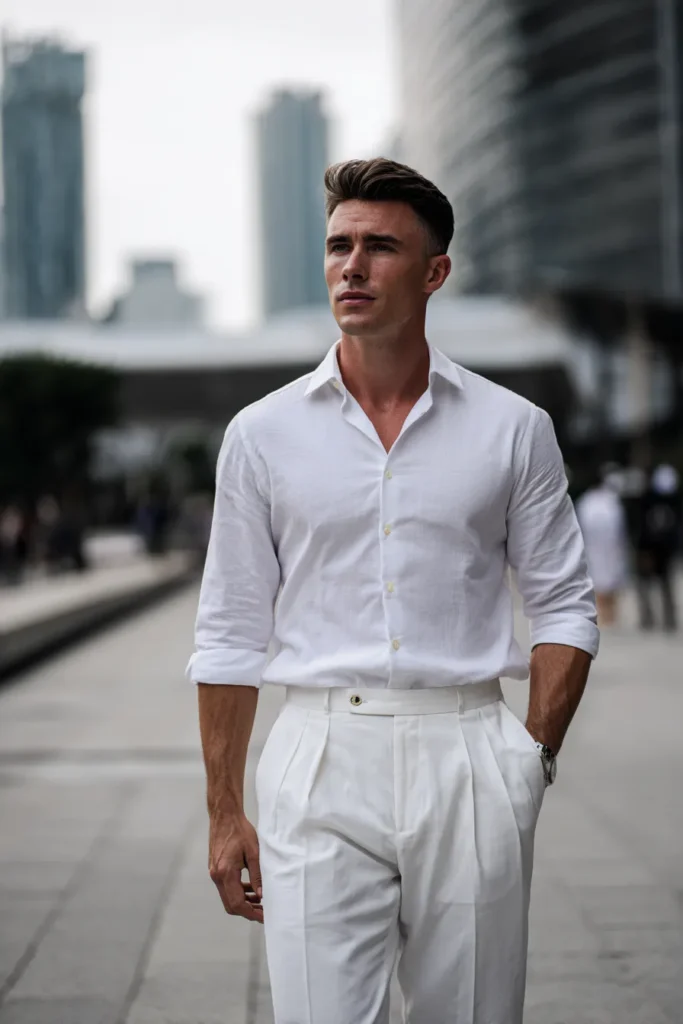This outfit is the definition of breezy summer elegance, relying on impeccable fit and light fabrics for its sophisticated appeal. The look is built around a crisp white button-down shirt, likely linen or a light cotton, styled with the sleeves rolled up and the collar slightly open for a relaxed, masculine feel. This is perfectly tucked into high-waisted, pleated white trousers that boast a beautiful, flowing drape and feel incredibly luxurious. The only accessory visible is a sleek metal wristwatch, maintaining the clean and sharp aesthetic.