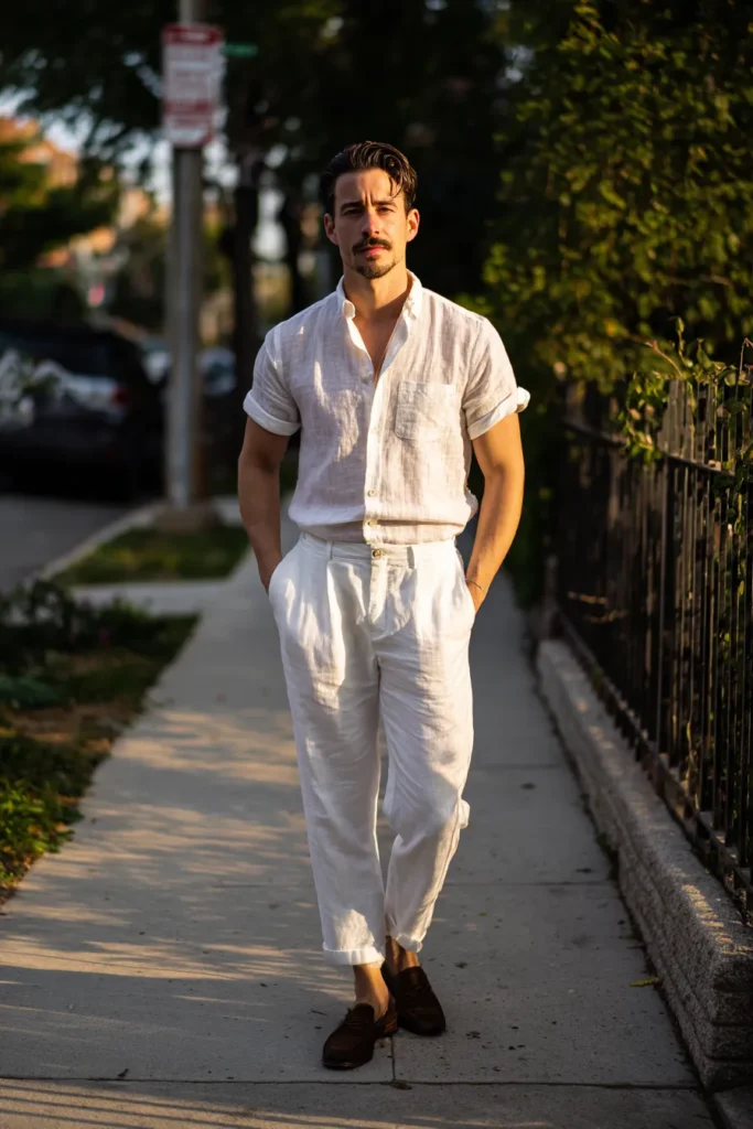 This outfit is the definition of relaxed summer luxury, perfect for those golden hour walks. He is wearing a crisp short-sleeve button-down shirt in a pure white linen, left casually open at the neck and slightly untucked, giving a very easygoing vibe. The shirt is paired with wide-leg, high-waisted linen trousers that are lightly pleated and cropped, showcasing a beautiful, comfortable drape. The entire breezy look is grounded with rich, dark brown suede or velvet slip-on loafers, which add a fantastic touch of warmth and texture against the white.
