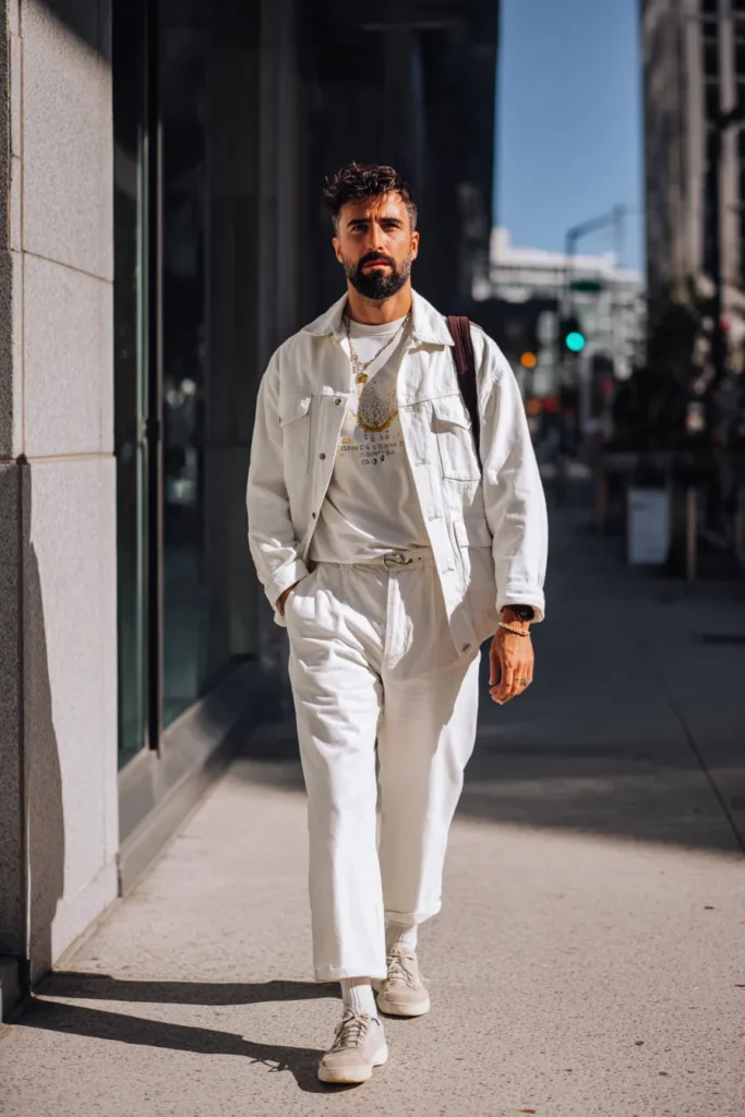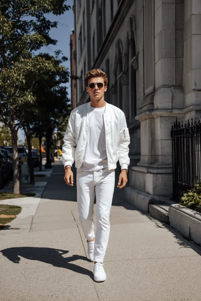 I love this look because it takes traditionally casual pieces and makes them look incredibly chic just by keeping everything bright and white. It’s perfect for a guy who wants to look stylish without wearing a suit or getting too fussy. If you’re into modern street style, this outfit shows how to use sharp tailoring, like the fit of that bomber jacket, even with denim. The fact that the shoes are just as clean and bright as the clothes is key here, truly making the whole look feel fresh and ready for anything.