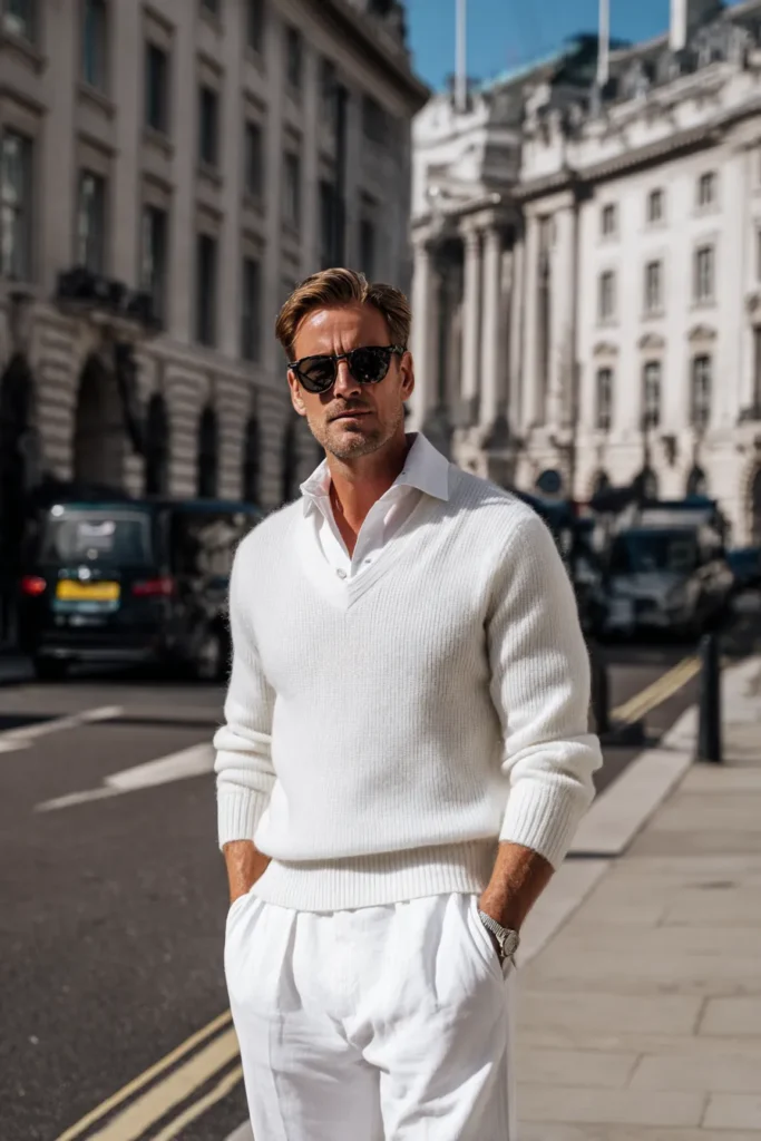 This outfit is the definition of breezy sophistication, perfect for a European cafe lunch or an early summer evening. The top is a relaxed, slightly slouchy V-neck sweater in a creamy off-white, featuring a gorgeous ribbed knit that adds lovely texture. He has paired this cozy piece with tailored white linen trousers that are subtly folded at the cuff, enhancing the laid-back yet polished vibe. Everything maintains a light, monochromatic feel, right down to the slip-on loafers in a beautiful pale beige or bone color, which look incredibly chic without socks.