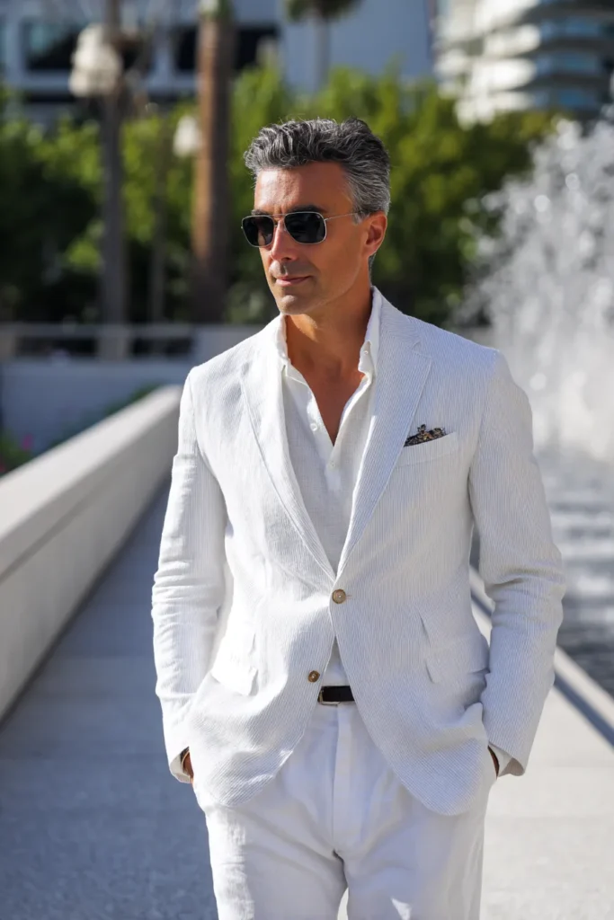 This outfit is the picture of high-end resort sophistication, perfect for a sunny day by the water. He is wearing a crisp white linen blazer that has a subtle, light pinstripe pattern, adding a cool textural element without breaking the all-white theme. Underneath, he layers a white shirt, left unbuttoned at the collar for a relaxed feel, and pairs the jacket with bright white linen trousers. The look is polished off with aviator sunglasses and a small, stylishly tucked pocket square featuring warm, contrasting tones.
