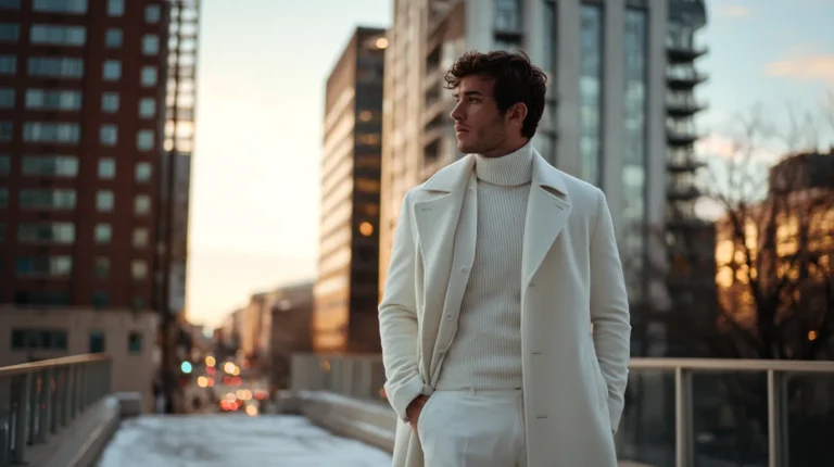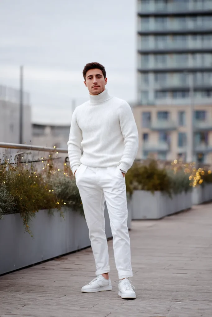 This sophisticated monochromatic look is a masterclass in clean, minimal style, perfect for those cooler seasons. The outfit centers on a ribbed, fitted turtleneck sweater in a brilliant white that feels both warm and luxurious. Below that, he’s wearing tailored white trousers that are cut slim and slightly cropped at the ankle, keeping the lines super sharp. Finishing the bright ensemble are a pair of crisp white leather sneakers, creating a seamless, head-to-toe white canvas that feels incredibly chic and refined against the muted, urban background.